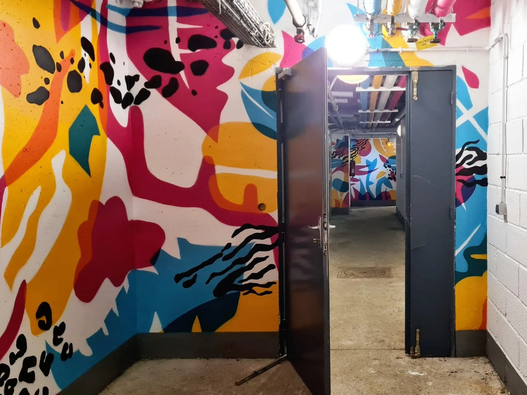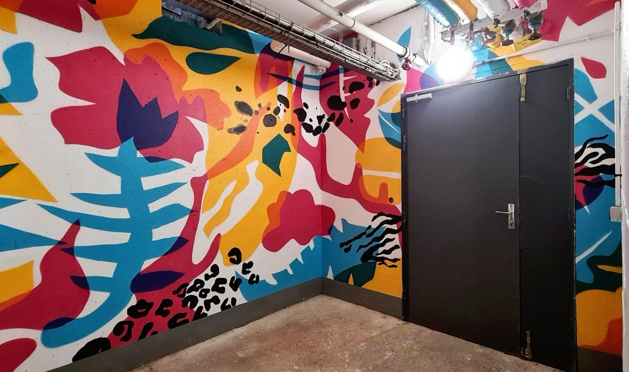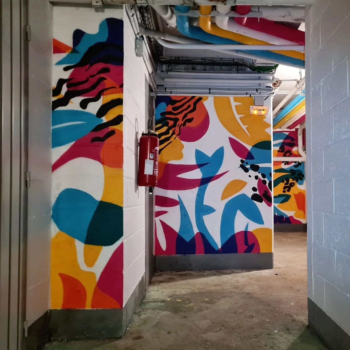 “Amener de la lumière et de la couleur dans un souterrain.” C’est la mission que nous a confiée Poste Habitat – Toit et Joie pour ce projet à Evry-Courcouronnes. Cette fresque immersive, intitulée Jungle (sub)urbaine, prend la forme d'une jungle onirique où la végétation se nourrit des couleurs distribuées par le réseau de tuyaux au plafond.