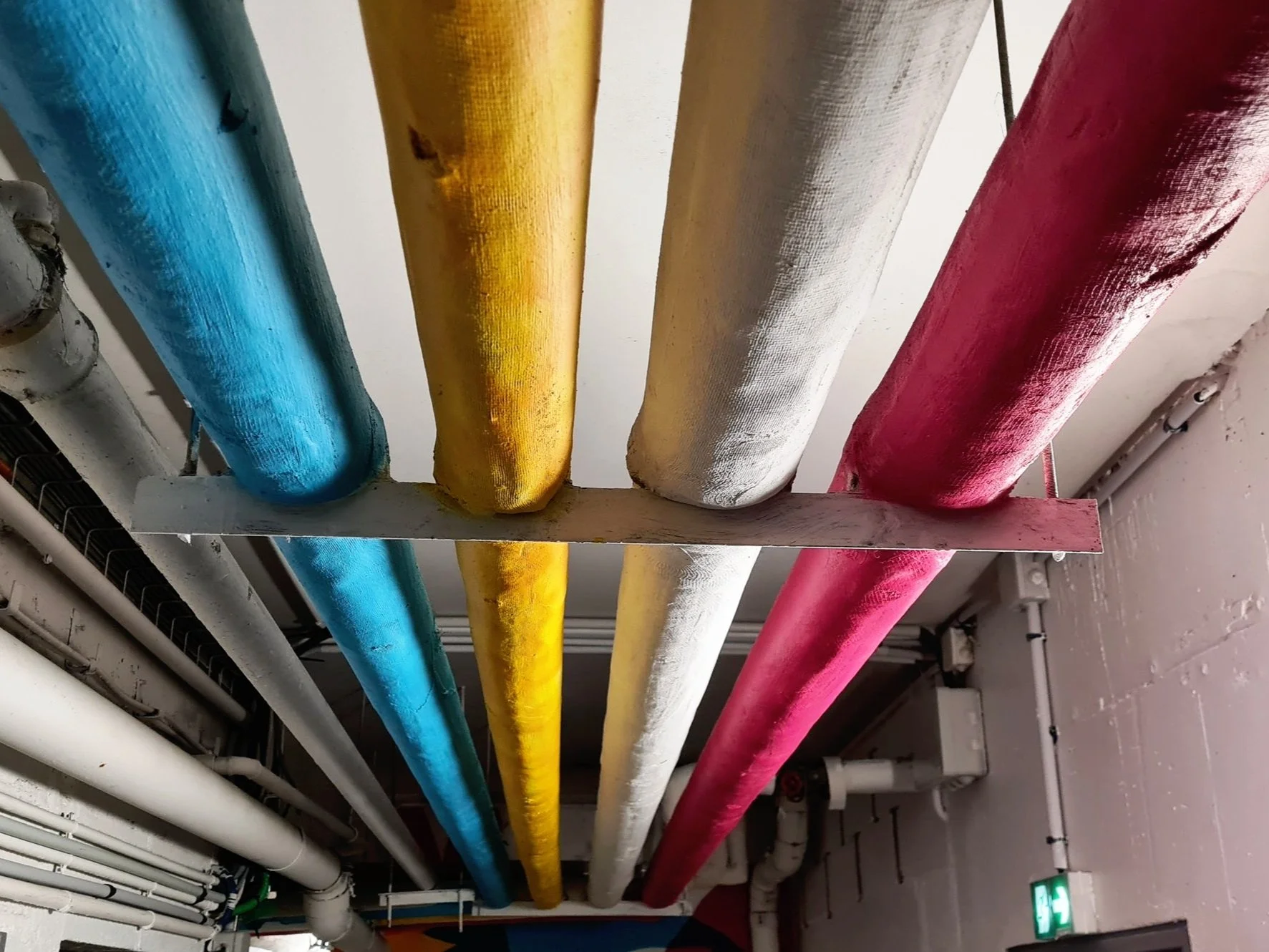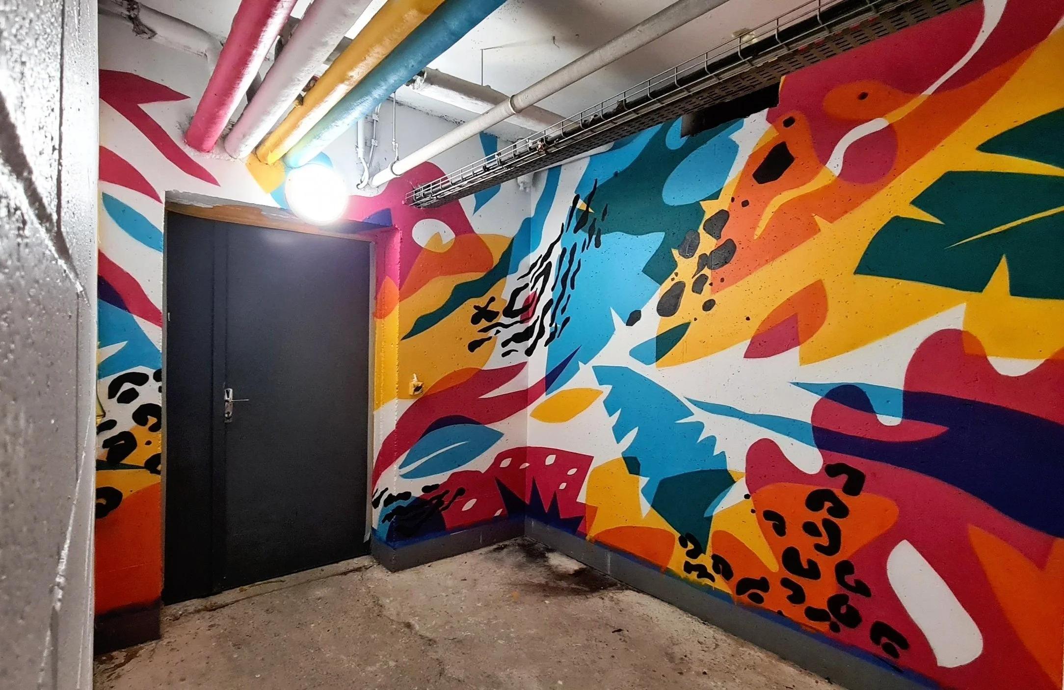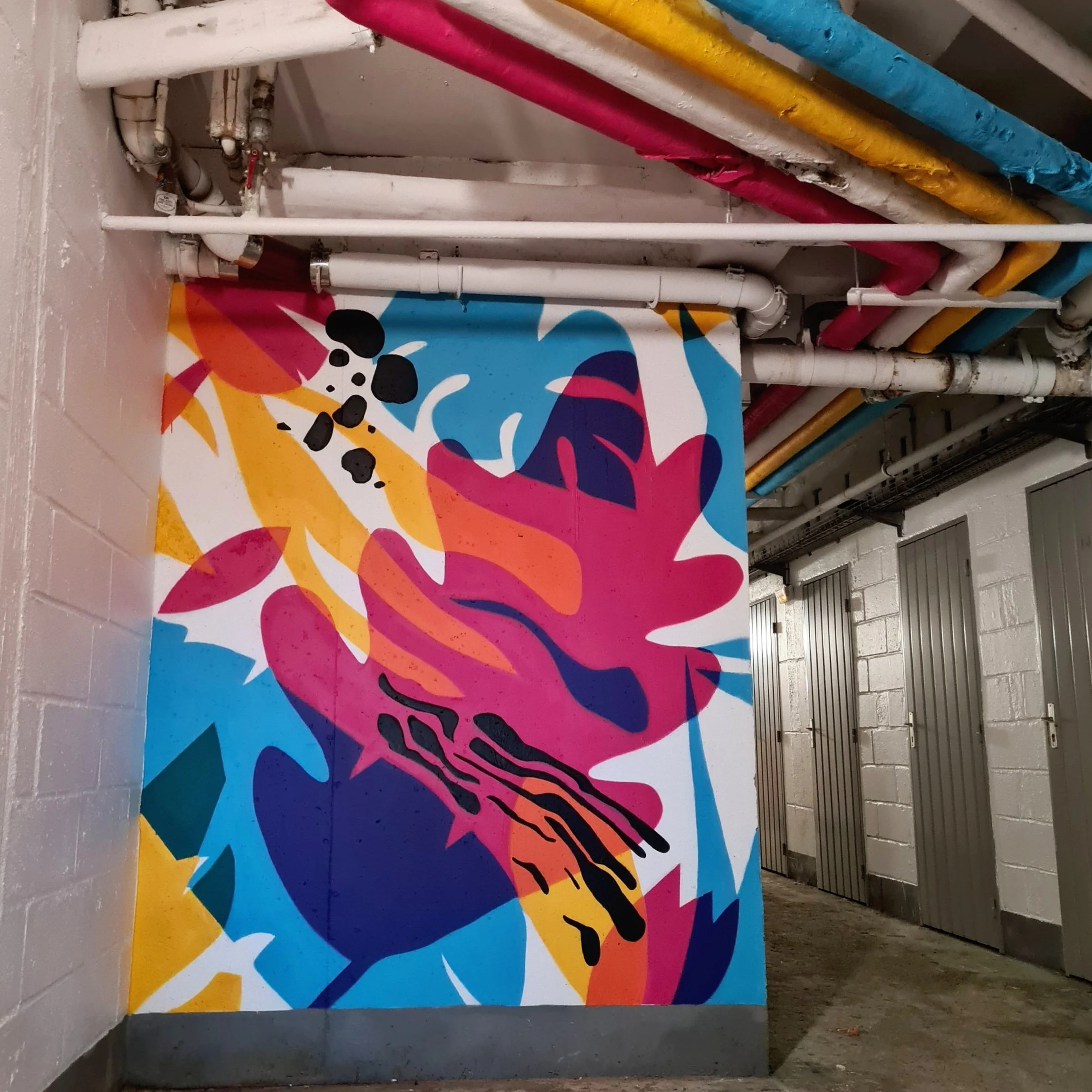 “Amener de la lumière et de la couleur dans un souterrain.” C’est la mission que nous a confiée Poste Habitat – Toit et Joie pour ce projet à Evry-Courcouronnes. Cette fresque immersive, intitulée Jungle (sub)urbaine, prend la forme d'une jungle onirique où la végétation se nourrit des couleurs distribuées par le réseau de tuyaux au plafond.