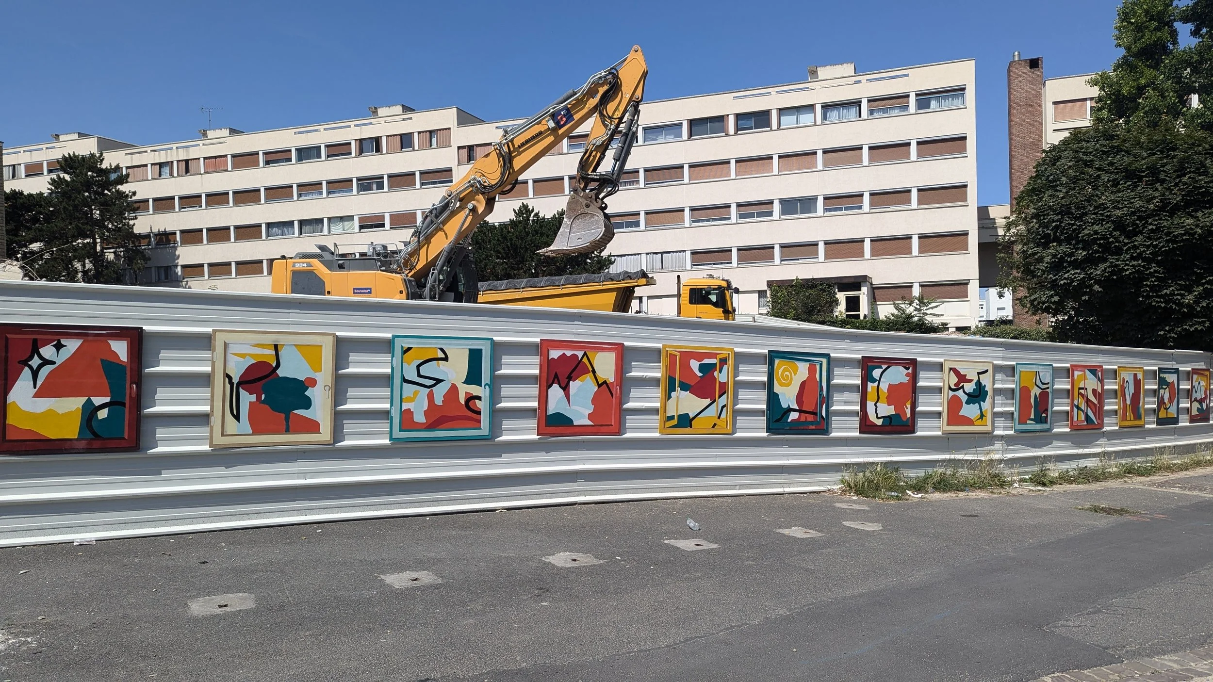 La municipalité de Longjumeau et Essonne Habitat nous ont sollicité en 2024 pour réaliser une “exposition outdoor” sur les palissades de chantier du quartier Sud, en pleine rénovation urbaine. Intitulée « Fenêtres sur l’imaginaire », cette exposition prend la forme de 20 tableaux pensés comme des fenêtres ouvertes sur un univers fantastique imaginé par les enfants de la ville. Au total, ils sont 57 à avoir pris les ciseaux et les pinceaux pour ce projet participatif.