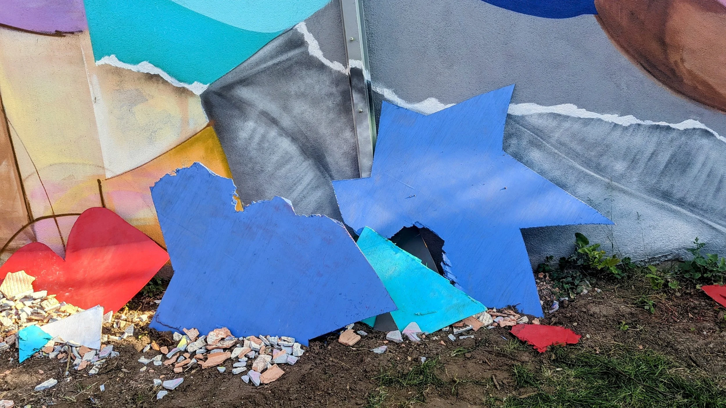 Entre fresque et sculpture, cette oeuvre raconte le point de rupture, l'instant de grâce, avant la fin. En lévitation, les morceaux du mur sont stoppés dans leur chute avant de s’écraser au sol. Les jeux de regards balayent la scène, passant de la nostalgie à la projection vers l’après. Le personnage central, lui, fixe le spectateur et l’ancre dans le présent. Figer la démolition était notre objectif. Le symbole que nous voulions apporter à cette exposition éphémère.
